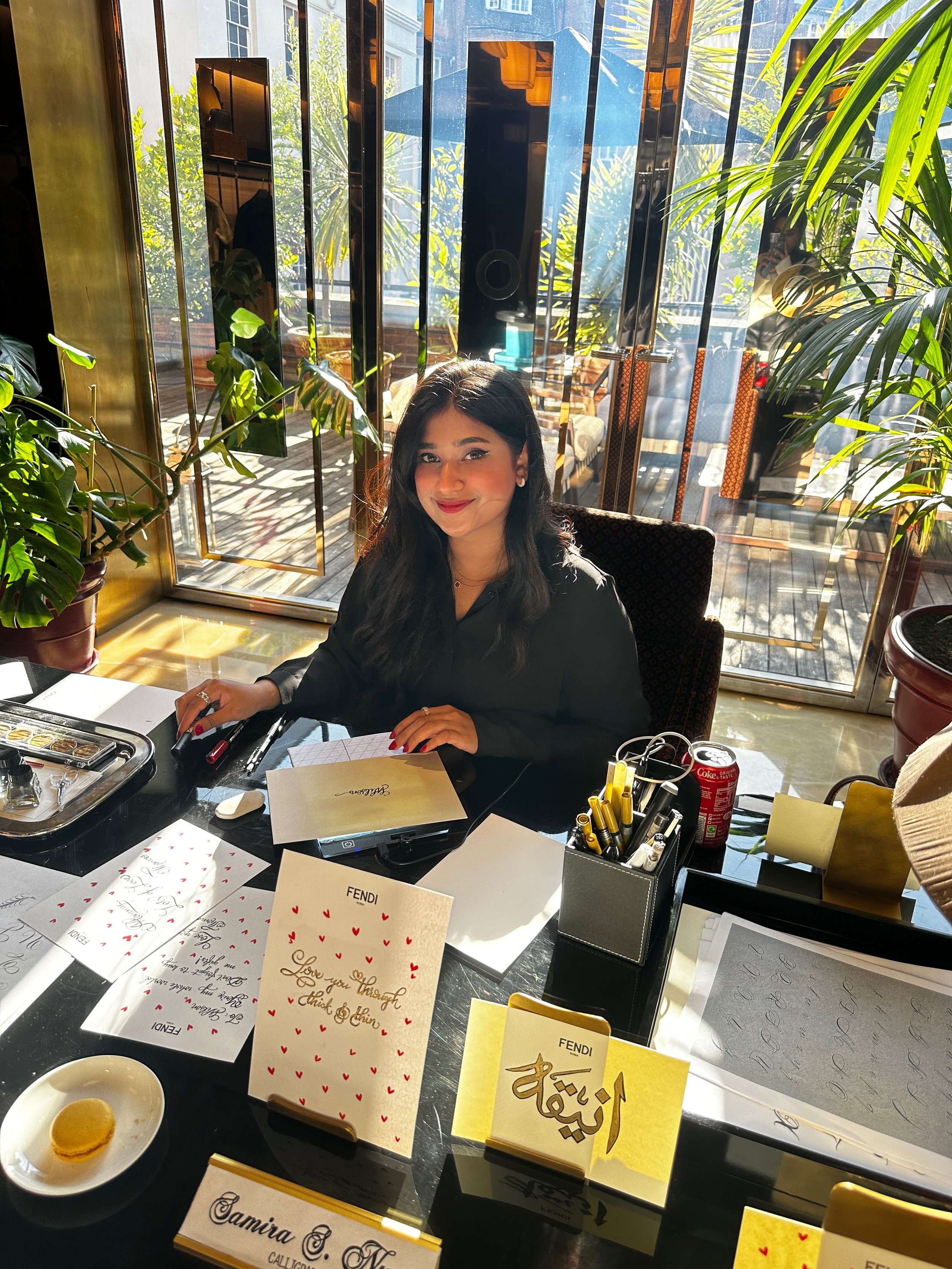 I’m Samira Nuri — a London-based freelance artist and lettering specialist crafting refined, personality-rich designs. From my origins in Dubai, I am self-taught in Arabic and Islamic calligraphy, I also work in Modern Calligraphy, blending tradition with contemporary style.
